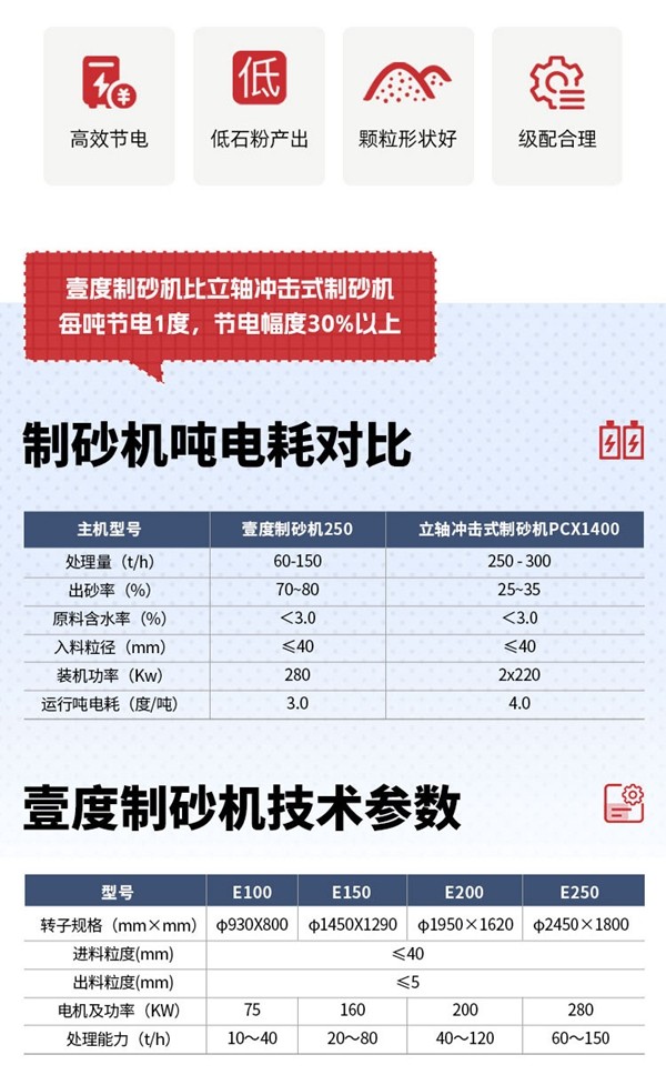壹度制砂机与“石打石”冲击式制砂机相比,节电可达30%,且出砂成品质量优良,符合国标二区标准。